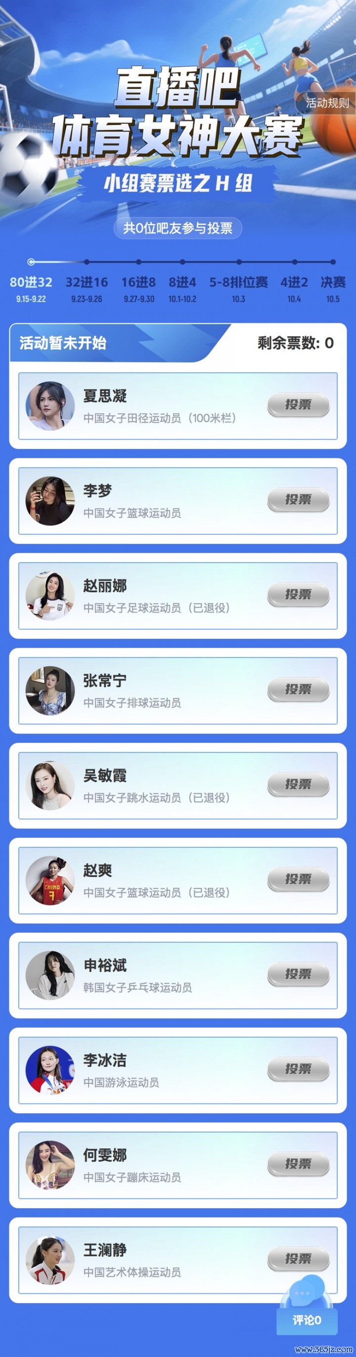 9月22日17:00,小组赛收官战H组的投票将正式开启,品味运动风采该组的参赛体育选手 分别是: