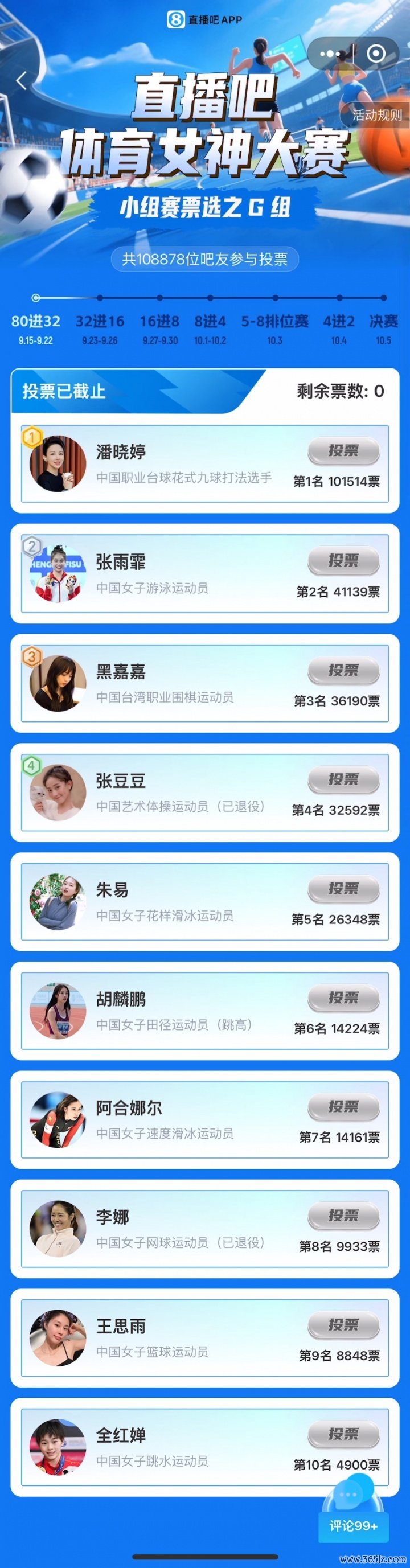截至今日10:00,小组赛G组的投票已全部结束(👉点击查看G组赛果),晋级下一轮 32强的体育选手 分别是: