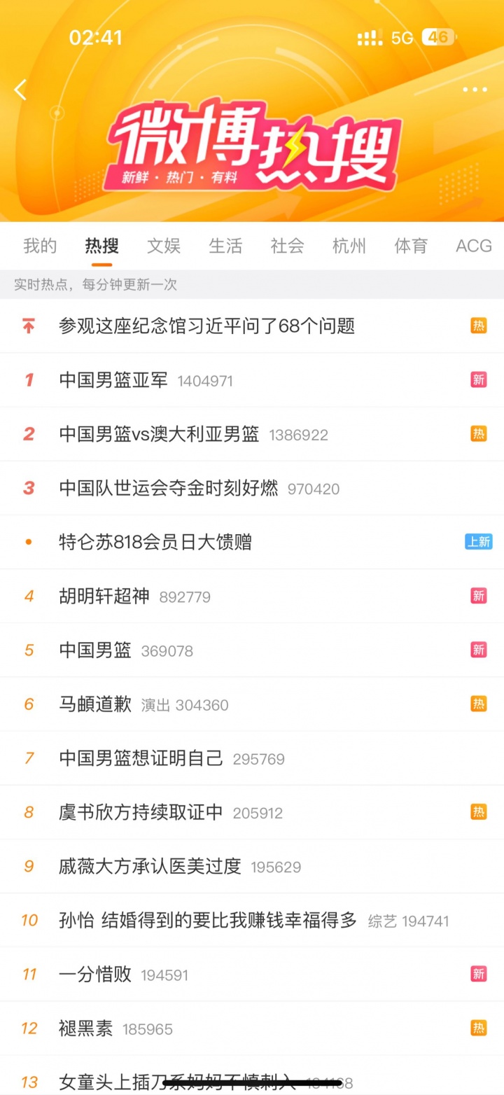 来自全国人民的认可!中国男篮冲上热搜榜第一并包揽前五词条!