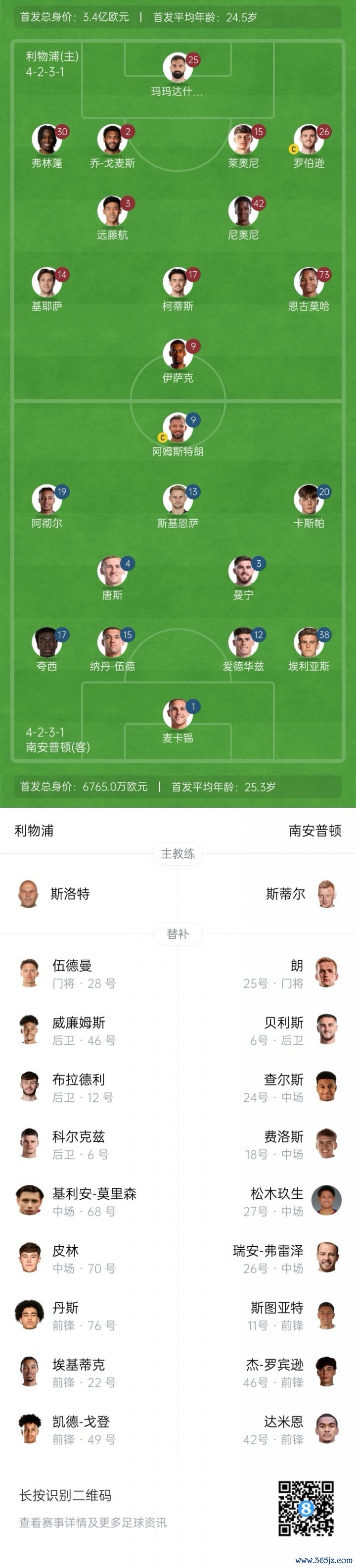 南安普顿替补:28-朗、6-贝利斯、24-查尔斯、27-松木玖生、26-瑞安·弗雷泽、18-费洛斯、46-杰·罗宾逊、11-斯图亚特、42-达米恩