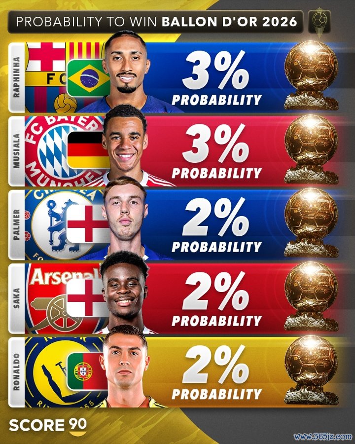 🏆外媒列2026金球概率:亚马尔18%领跑,姆巴佩17%,登贝莱5%