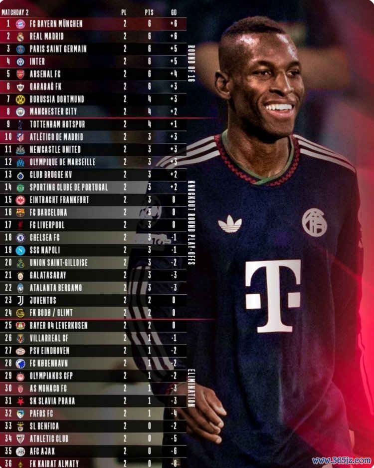 拜仁官推晒两轮过后欧冠积分榜:拜仁以进球优势领跑,皇马次席