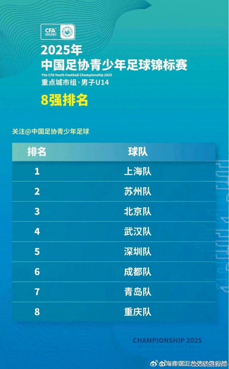 本次2025年中国足协青少年足球锦标赛重点城市男子U14组比赛共进行三个阶段的赛会制比赛,共15支球队参赛。上海U14在第一阶段列第五名降至第二阶段B组,第二阶段上海U14位列第7名晋级第三阶段的1-8名排位赛。进入第三阶段后,品味运动风采上海U14开始发力, 足球资讯在小组赛中先后以2-1、4-1、2-0的比分分别战胜深圳、武汉、成都, 网球新闻体育直播顺利晋级半决赛。在半决赛中,上海U14与北京队苦战90分钟打成2-2平,点球大战4-3战胜对手晋级决赛。决赛中,上海U14面对苏州队3-0兵不血刃战胜对手夺得冠军,汇龙青训球员周俊怡梅开二度帮助球队锁定胜局。