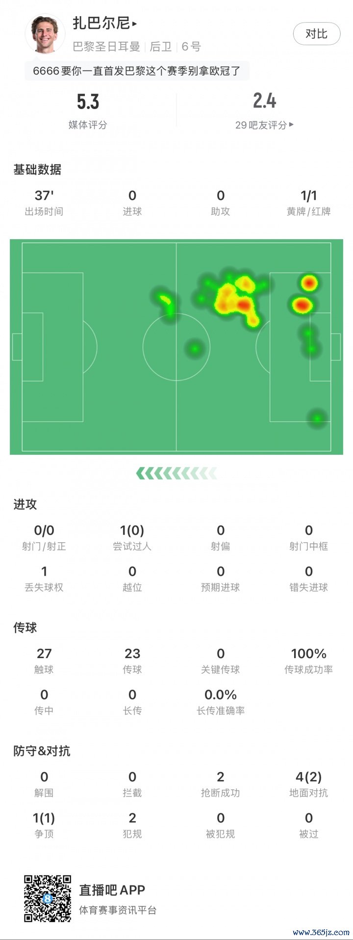 踢得有点卧底!巴黎后卫扎巴尔尼两次送点+拿到红牌被罚下