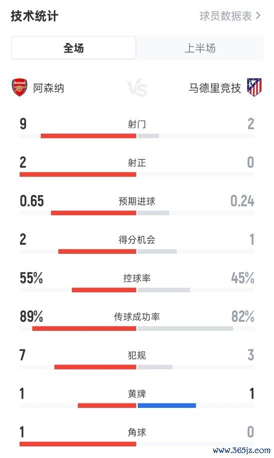 阿森纳半场0-0马竞数据:射门9-2,射正2-0,控球率55%-45%