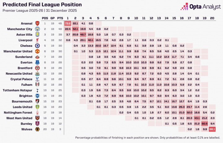 #世界杯抽签# 阿森纳5分领跑! opta最新预测夺冠概率: 阿森纳73.2%, 曼城22.4%