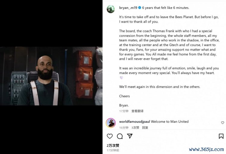 曼联新援姆贝莫社媒告别布伦特福德:6年就像6分钟一样短暂