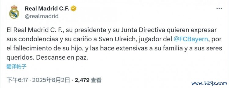 皇马社媒:对乌尔赖希儿子的去世表示哀悼,向其家人致以诚挚慰问
