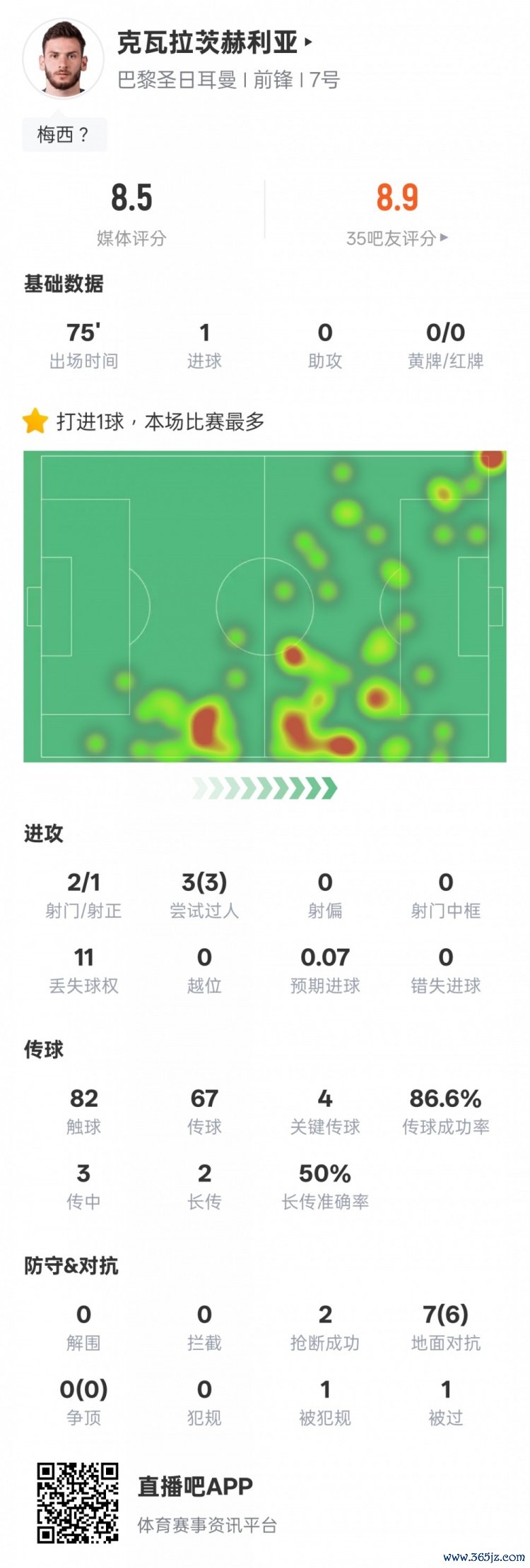 克瓦拉茨赫利亚本场数据:1得分 3过人成功4关键传送球 ,评分8.5