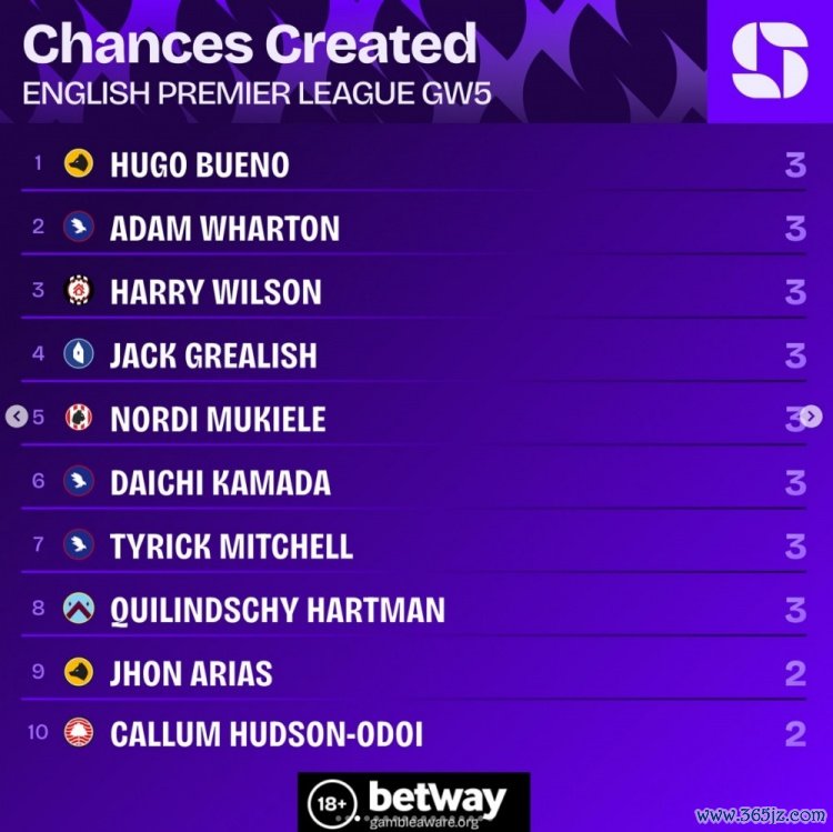英超第5轮创造机会榜:乌戈-布埃诺等8名球员各创造3次机会