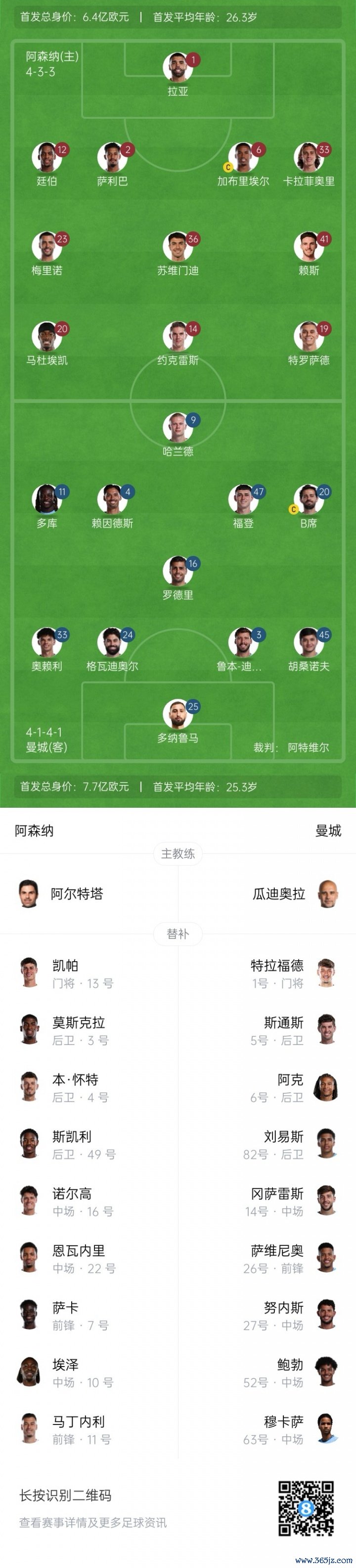 阿森纳vs曼城:约克雷斯PK哈兰德,萨利巴、多库出战埃泽萨卡后备