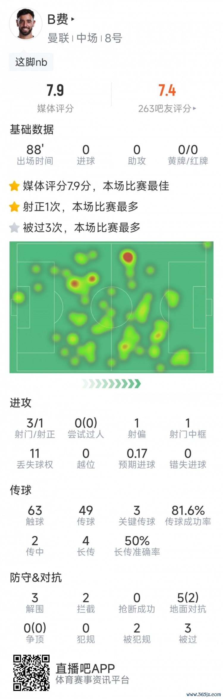 - B费本场数据:3次关键传送球 ,3射1正,1次中框,3次解围