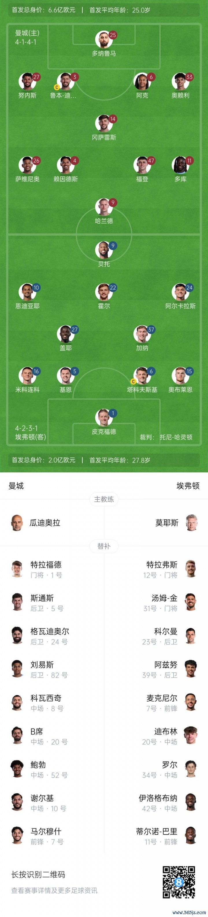 曼城杆位:25-多纳鲁马、3-鲁本-迪亚斯、6-阿克、33-奥赖利、4-赖因德斯、14-尼科-冈萨雷斯、27-努内斯、9-哈兰德、11-多库、26-萨维尼奥、47-福登