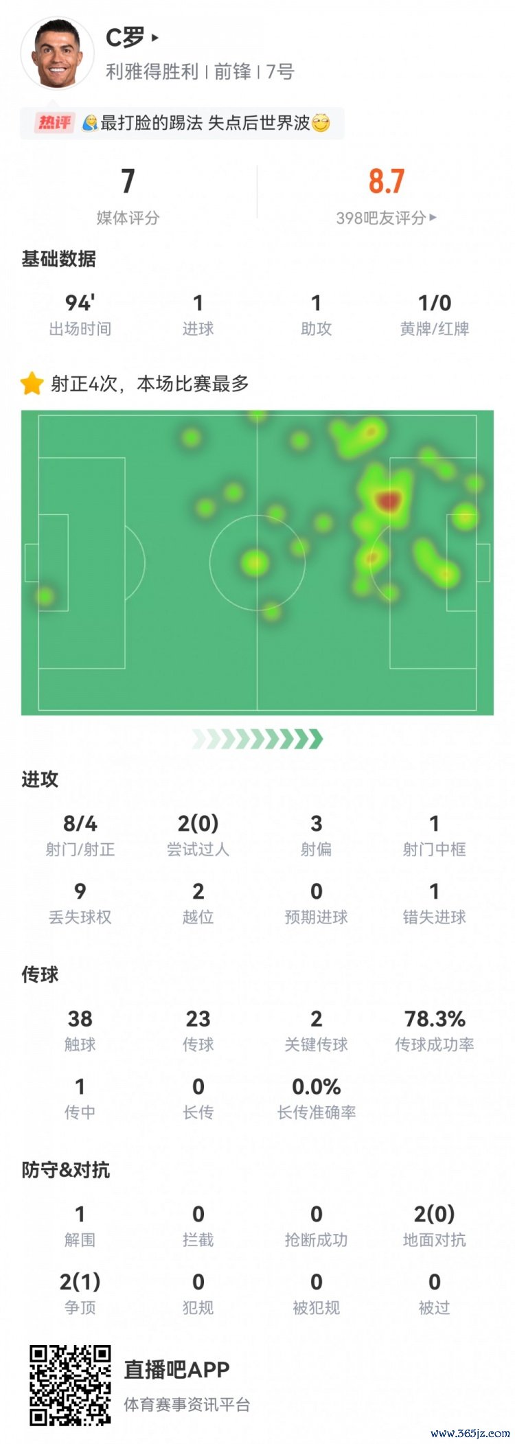 C罗数据:8射4正传射建功,1次失点1次中框2次关键传送球 ,评分7.0