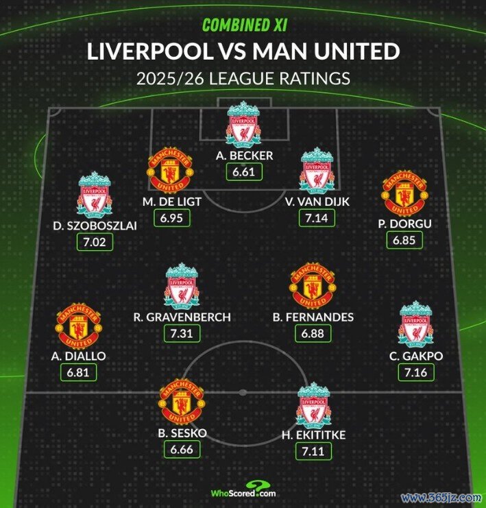 Whoscored列双红会本赛季评分最高阵:埃基蒂克领衔,B费在列