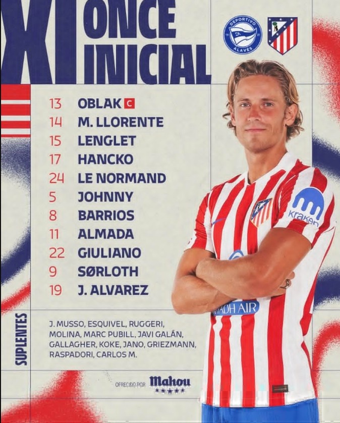 马竞客战阿拉维斯杆位:小蜘蛛领衔,新援阿尔马达、汉茨科在列