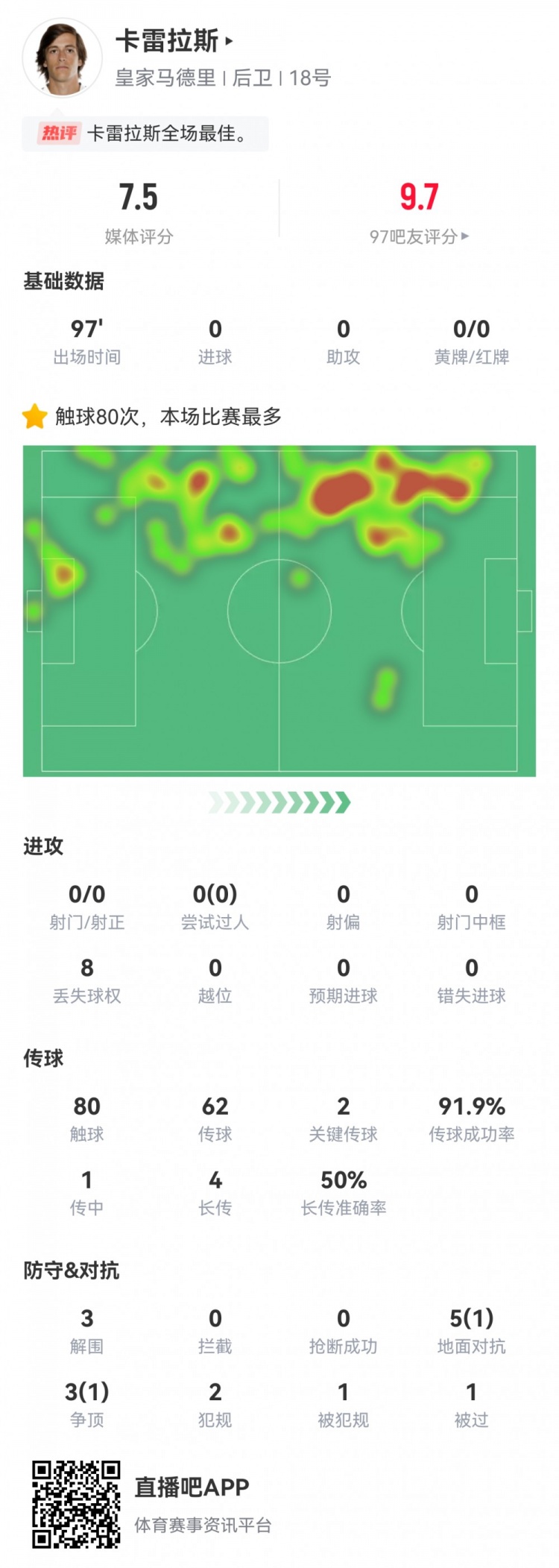 关键门线解围攻防俱佳!卡雷拉斯数据:2关键传送球 3解围,评分7.5